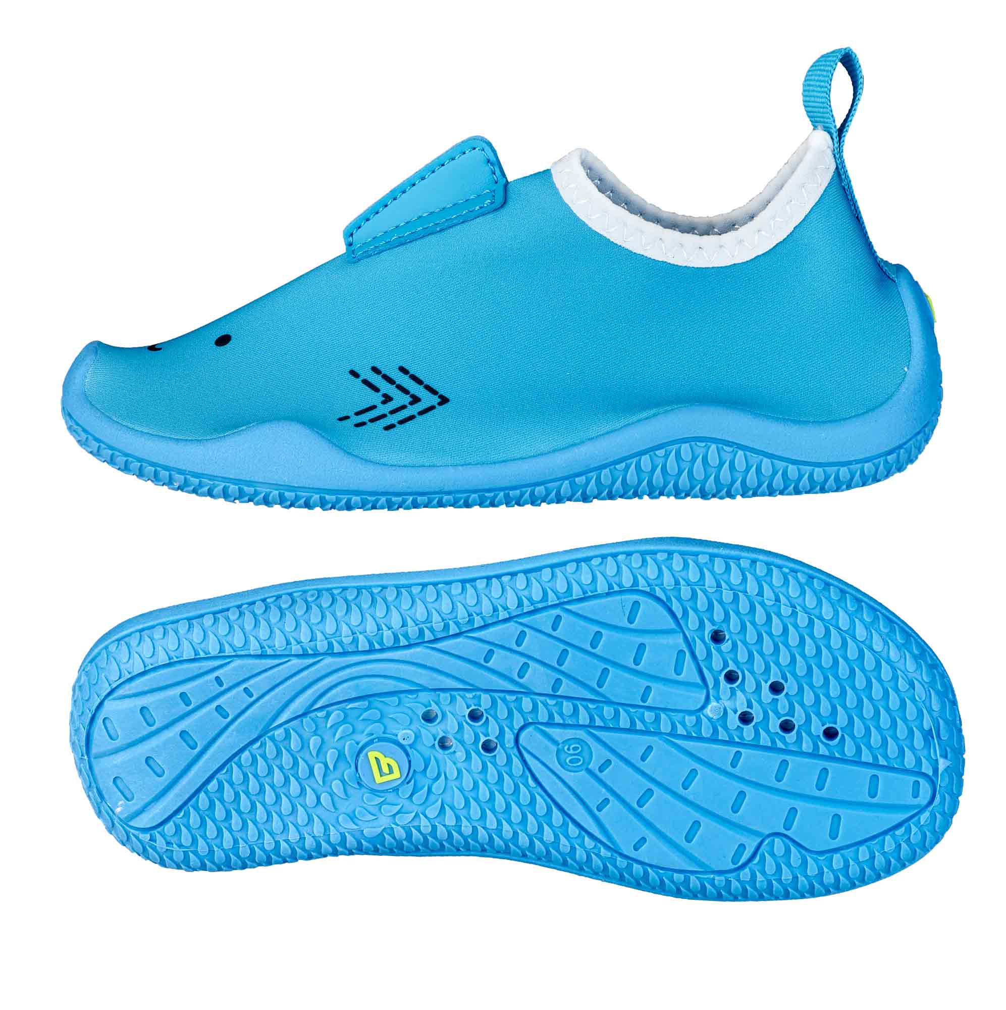 Dieses Modell wurde speziell für Kinder konzipiert und zeichnet sich durch die etwas robuster gestaltete Sohle aus. Sie ist an mehreren Stellen hochgezogen, um auch im Gelände ausreichend Schutz und Stabilität zu bieten, ohne den Fuß seiner natürlichen Stärken zu berauben. Die Anti-Rutsch Sohle bietet sicheren Halt und Schutz, auch im nassen Element, da sie mit Abfließöffnungen und einem fein perforierten Kunststoffnetz ausgestattet ist.